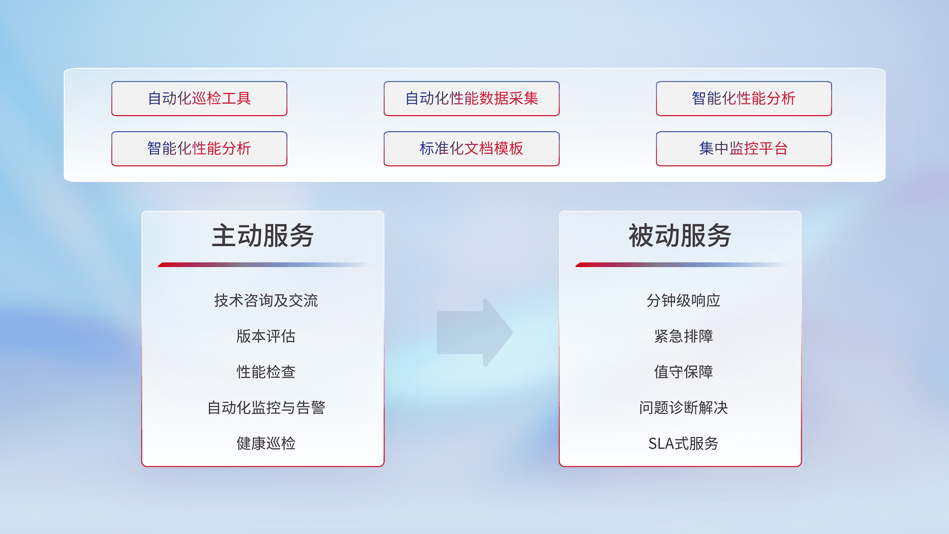 智能化工具和标准化文档,,保障服务质量,,,提供主动服务(包含技术咨询、、、版本评估、、、性能检查、、、自动化监控与告警、、、、健康巡检)和被动服务包含(分钟级响应、、、紧急排障、、、值守保障、、、问题诊断解决、、SLA服务)。。